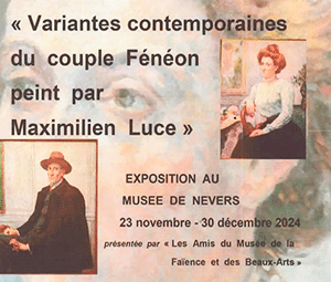 Le musée de la Faïence et des Beaux-Arts de Nevers est situé dans l’ancien quartier occupé par les faïenciers du XVIIe au XIXe siècle. Il présente principalement des faïences, des peintures, et des sculptures. Pour une exposition présentée en novembre et décembre 2024 dans la salle capitulaire, intitulée « Variantes contemporaines du couple Fénéon », les amis du musée, sous l’impulsion de son président Michel Philippart (voir chronique dans le n° 181 de Florilège), eurent l’idée de présenter un projet original sur le thème de « La notion de couple chez les êtres humains ». Diverses contraintes étaient imposées aux participants, dont celle d’assembler deux œuvres, représentant chacune un des deux êtres du couple, et d’y inclure des allusions à plusieurs autres œuvres picturales historiques identifiables, dont la reprise modifiée d’un ou plusieurs éléments des tableaux de Luce représentant les Fénéon. Richesse de la création nivernaise